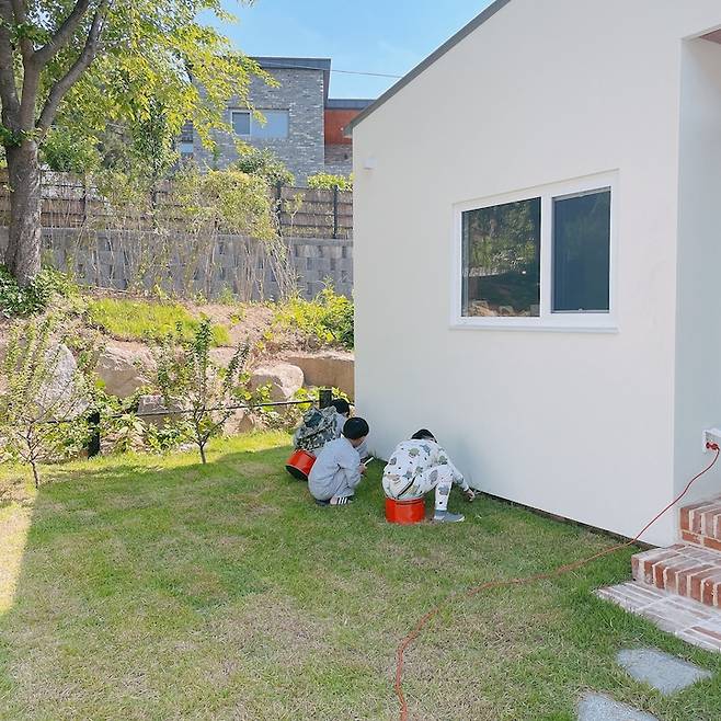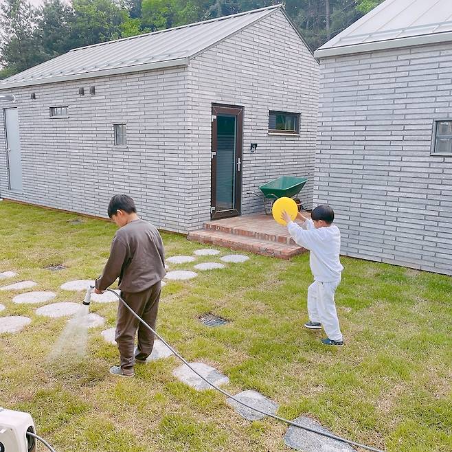 처음 잔디를 깔고 나서 물을 한참 주어야 했는데, 아이들도 서로 하겠다며 손을 도와요. 마당이 생겨서 좋다며 공놀이도 하고요.