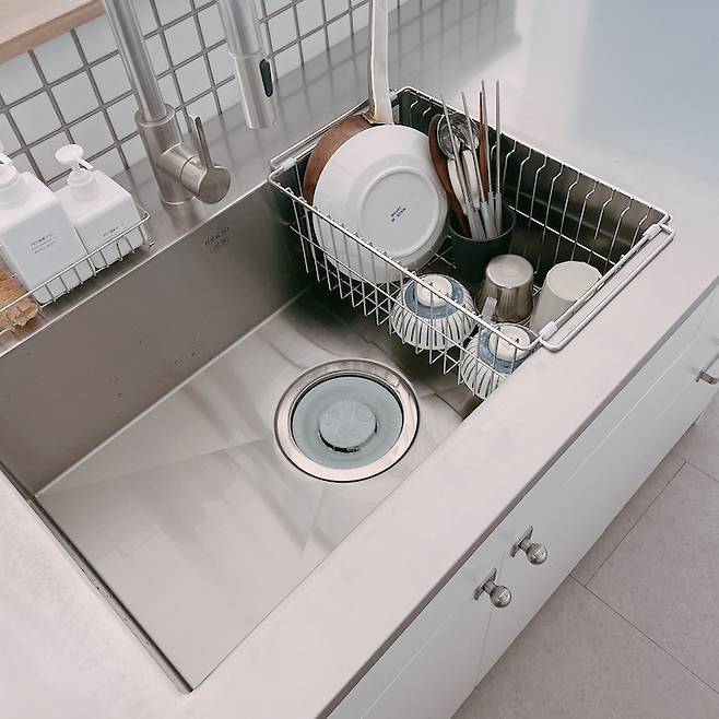 설거지 건조대는 원래 무인양품 제품을 사용했는데, 백조 싱크에서 주신 제품이 싱크볼에 쏙 들어가고 작고 깊어서 쓸모가 더 좋아서 지금까지 잘 사용하고 있어요.