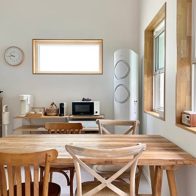 주방가전은 대부분 아이보리나 화이트로 색을 맞추었어요. 생활감이 느껴지는 것들은 서랍이나 바구니에 넣어주면 시각적으로도 안정된 느낌이 들어요. 식탁은 단순히 밥만 먹는 공간이 아니라 공부도 하고 책도 읽고 장난감을 가져와 놀기도 하는 곳이라 여러 가지 물건들이 많기 때문에 각자의 자리를 만들어주고 가족들에게도 알려주면 정리할 때도 잔소리를 덜하게 되네요.