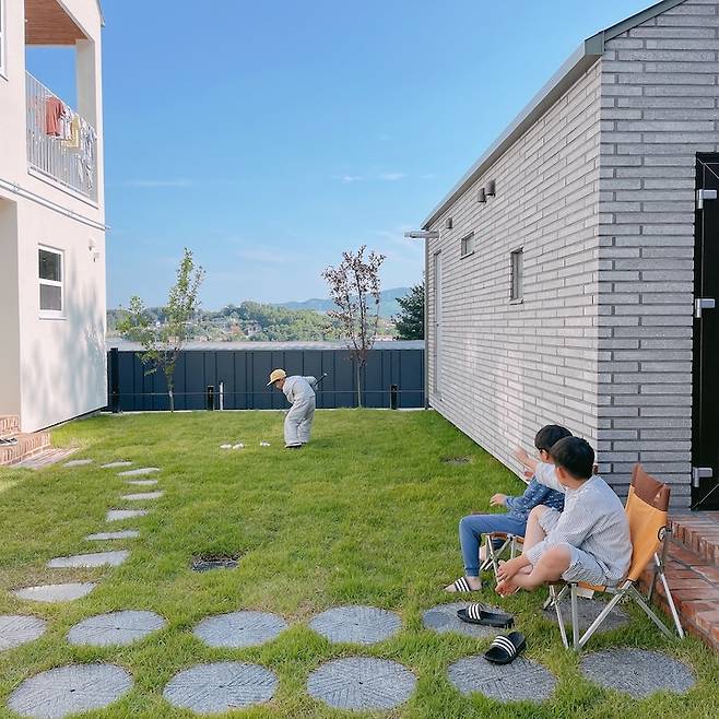 언니와 함께 공유하는 마당은 폭은 좁지만 길쭉해서 서로 왕래하며 자주 논답니다. 초록 잔디는 주택살이에서 빠질 수 없어서 디딤석빼고 다 깔아주었는데, 요 잔디가 은근 손이 많이 가는 녀석이에요. 잔디 깎이 사용법도 모르던 제가 이제는 남편 없이 혼자서도 잔디를 잘 깎아요.