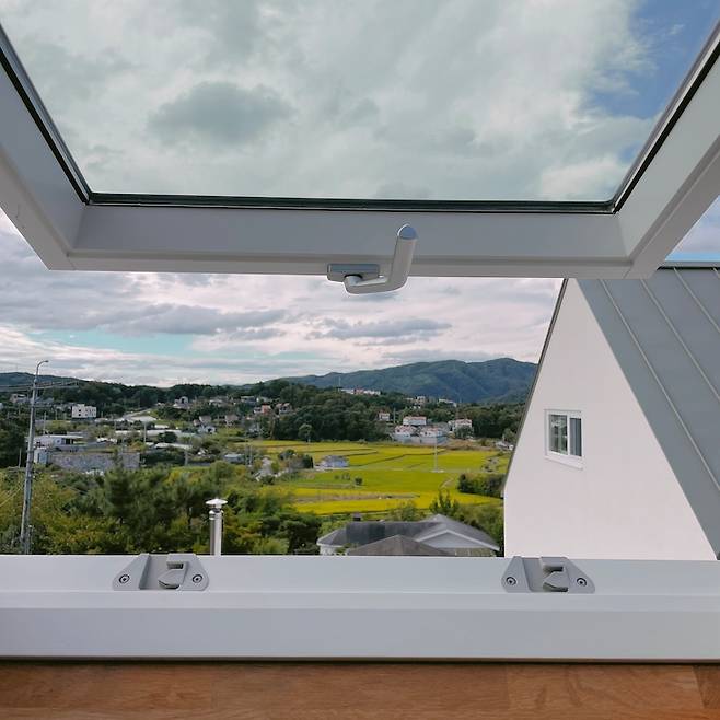마지막 사진은 다락 천창으로 본 마을의 모습이에요. 뜨거운 여름을 지나 벼도 조금씩 노란빛을 띄며 무르익고 있네요. 저의 집 짓기와 인테리어에도 뜨거운 한때를 지나 좀 더 익숙해지고 편안해지는 시기에 들어왔어요.