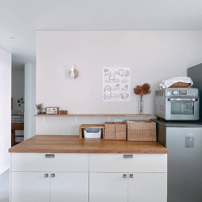 뒤에는 그릇과 컵, 그리고 식자재를 수납할 수 있는 싱크대와 냉장고를 나란히 두었어요. 예전에는 선반에 진열해놓고 꺼내 쓰는 게 좋았는데 대면형 주방에는 위에 싱크대를 달 수가 없어서 모두 서랍에 수납을 했답니다. 아무래도 선반에 올려놓으면 먼지에 노출되고 자주 청소해 줘야 해서 폭이 좁은 긴 선반 하나만 두어서 분위기에 따라 물건을 올려두고 있어요. 그리고 자잘한 용품들은 바구니에 넣고 패브릭으로 덮고요.