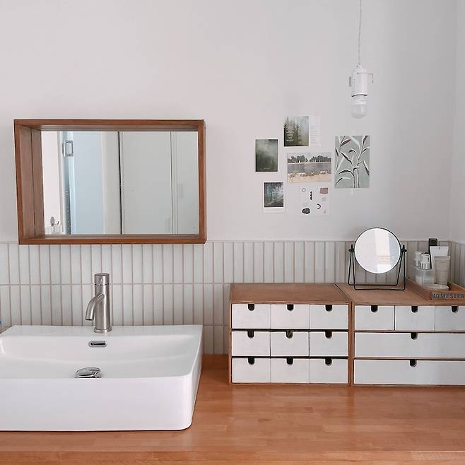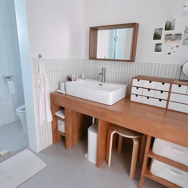 꽤 길쭉한 공간이어서 아래로 배수관과 의자 넣을 공간, 수건과 비상약품을 넣을 공간, 화장품 외 드라이나 미용도구를 넣을 공간을 나누어 선반도 만들었어요.4인 가족이 자주 사용하는 곳이지만 변기와 세면대를 구분해놓고 사용하니 편하더라고요. 물론 노출 세면대가 화장실 안에 있지 않고 바닥도 마루고 세면장이 원목이기 때문에 자주 물기를 닦고 관리해 줘야 해서 손이 더 가긴 해요. 그래도 이쁘니까요:)