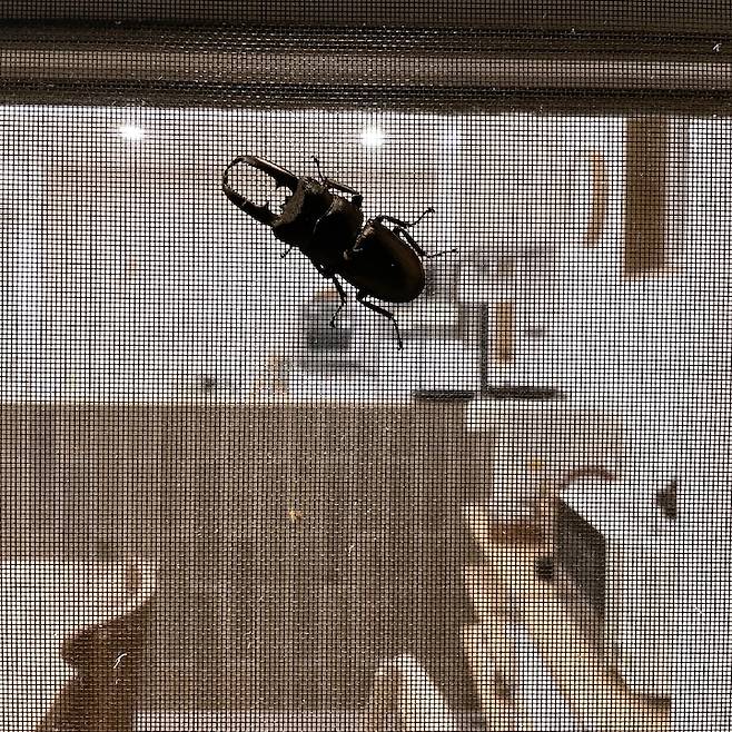 여름밤 주방 방충망에 붙어 있던 사슴벌레.