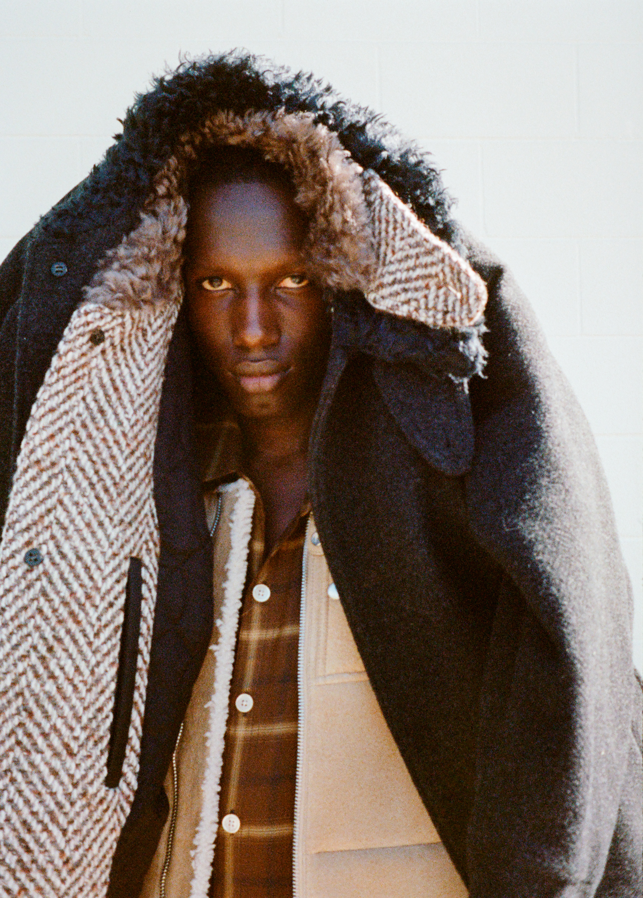 볼드한 울 소재의 오버사이즈 코트로 구성되어 있습니다.