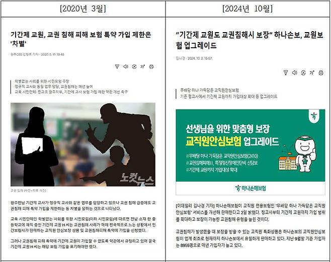 2024년 10월2일, 하나손해보험㈜ 교직원안심보험 가입 대상 확대 기사가 나왔다. 이제는 기간제교사도 특약 가입이 된다는 것이다. 진짜인지 확인해보고 싶은 마음에 다시 보험회사에 전화했고, 기간제교사도 특약 가입되냐고 물어보았다. 상담원은 그런 기사는 나왔지만, 본사 지침을 확인해본다는 것이다. 조금 후 상담원에게 전화가 왔다. 기간제교사도 특약 적용된다고 했다. 나는 바로 보험에 가입하였다. 지난 시간 우리의 몸부림과 투쟁이 헛된 일이 아니었음이 증명되었다.