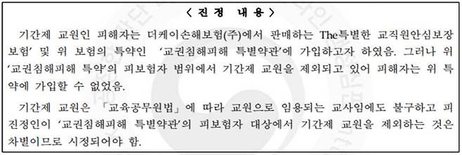 너무나도 부당한 마음이 들어서 광주지역 시민단체인 ‘학벌없는 사회를 위한 시민모임’ 박고형준 활동가에 이 사실을 알렸다. 그러자 박고형준 활동가는 교직원안심보험에 가입은 가능하지만, 특약에만 기간제 교사가 제외되는 것은 명백한 차별행위라는 인식을 함께하였다. 그리고 아래와 같이 국가인권위원회에 진정을 넣었다.