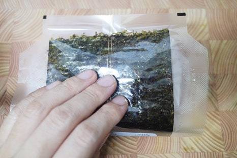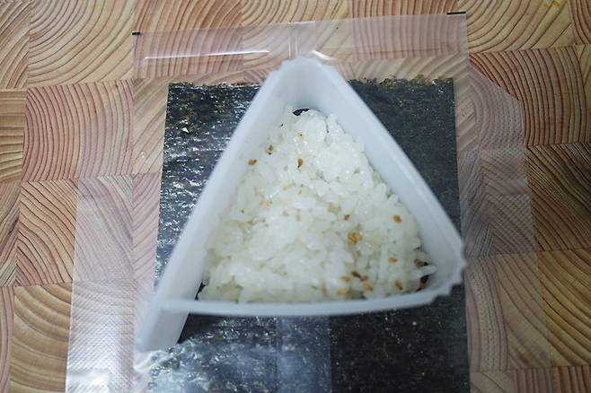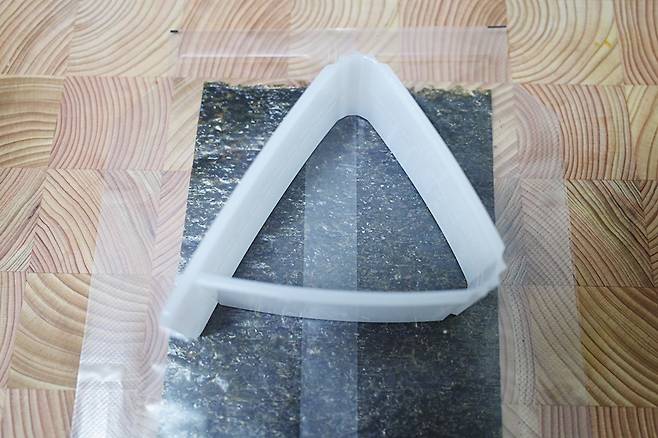 비닐에 삼각김밥 김을 펼쳐 놓고 삼각김밥 틀을 올립니다.