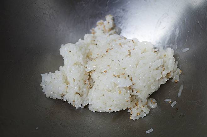 양념한 밥은 밥만 먹어도 고소하고 맛있어요. 삼각김밥의 기본이 되는 중요한 단계랍니다.