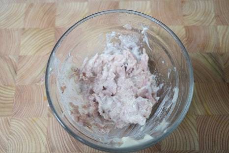 볼에 담은 참치에 마요네즈 2스푼을 넣고 섞습니다.