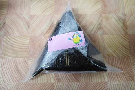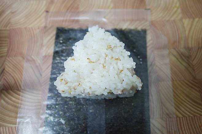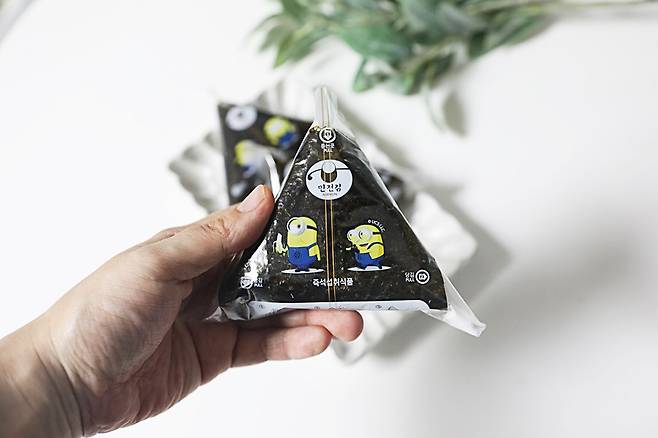 김으로 삼각김밥을 감싸고, 마지막에 스티커로 고정해주면 완성입니다.