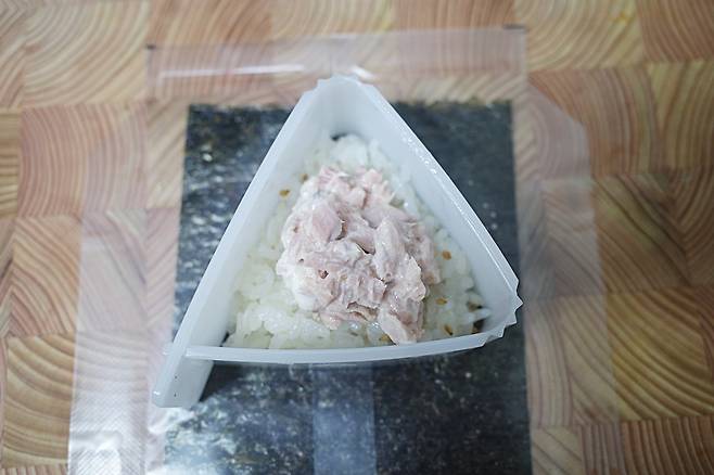 밥 위에 참치마요를 적당히 올리고, 다시 밥을 덮어 틀에 꽉 채우세요.