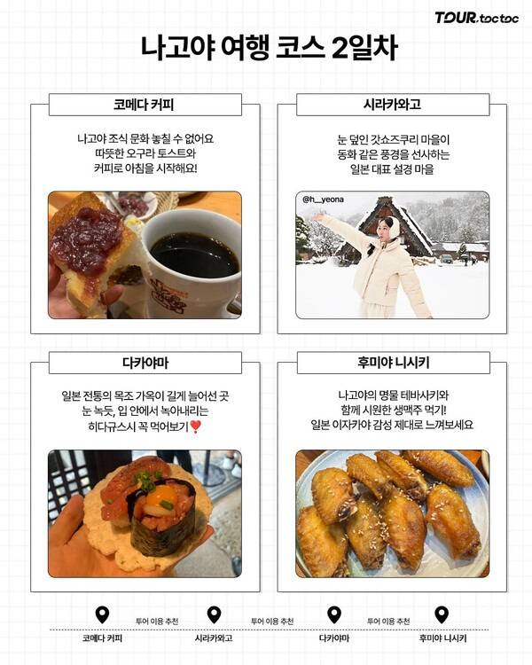 유명 관광지의 번잡함은 피하고, 근교의 설경 명소부터 지역 맛집, 쇼핑까지 알차게 채운 일정으로 나고야를 여행해보세요.