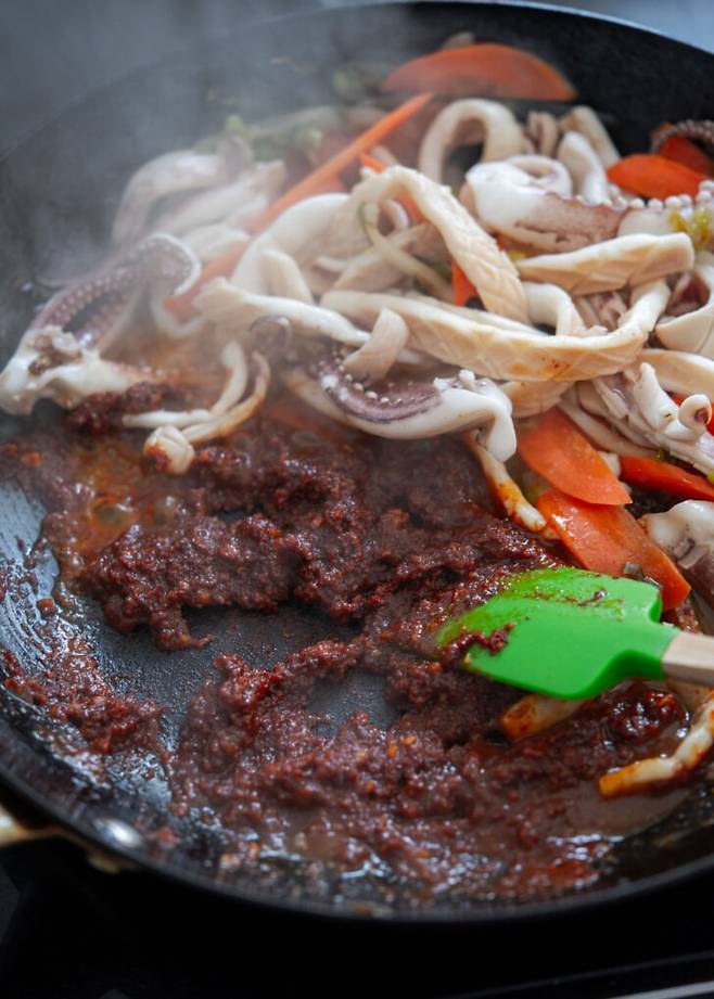 • 오징어는 오래 익히면 질겨져요. 반드시 센 불에서 ‘빠르게’ 볶아야 부드럽습니다.