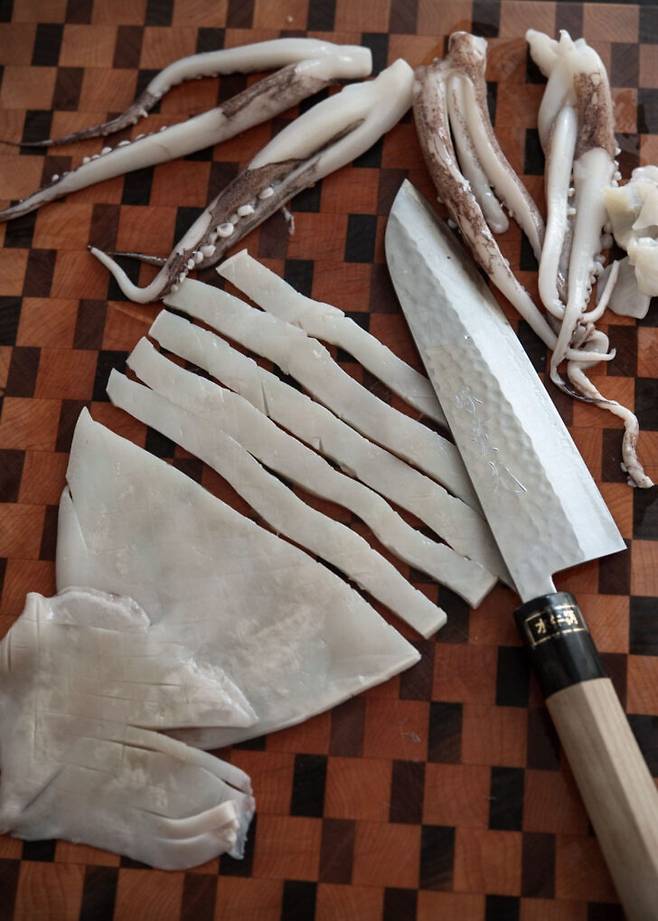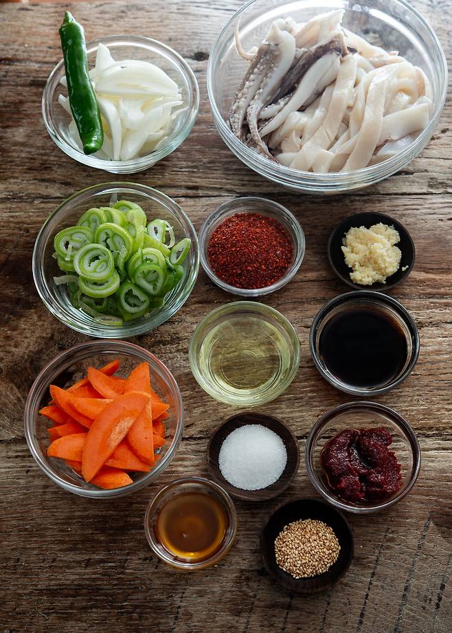 1. 오징어는 먹기 좋게 썰고, 채소는 채 썰어둡니다.