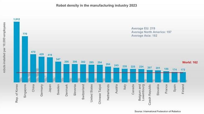25일 IFR이 공개한 세계 로보틱스 2024 보고서 중 로봇과 공장 직원의 비율을 살펴보면 한국은 지난해 직원 1만명당 로봇 1,012대로 사상 최고치를 기록했다. 2위는 싱가포르가 차지했으며 중국은 3위로 포디움 마지막 자리에 이름을 올렸다.
