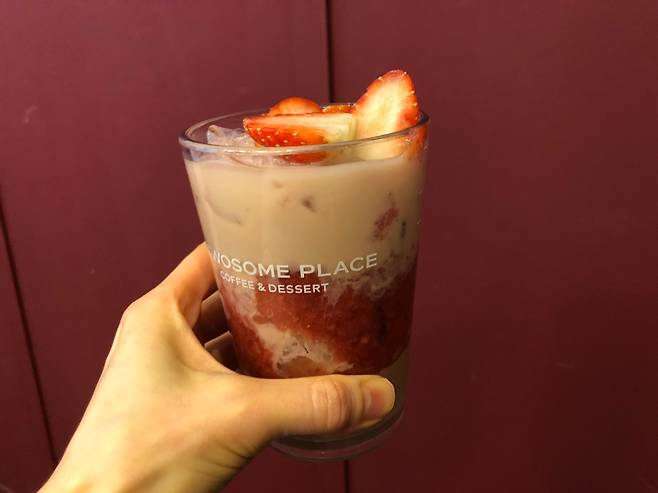 비주얼부터 시선을 압도했는데요. 딸기와 화이트 초콜릿, 쿠키를 블렌딩한 제품이에요.