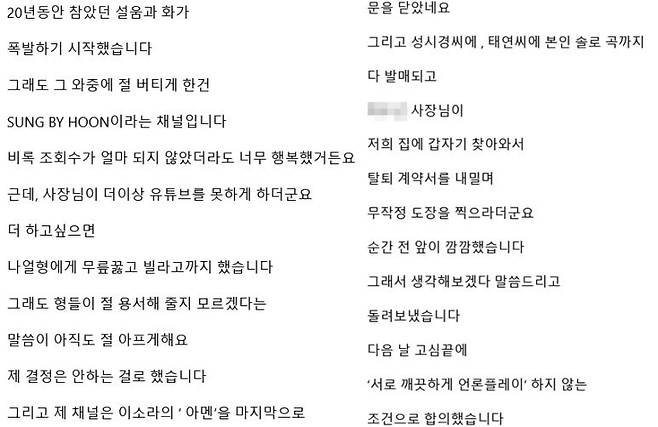 그는 "2022년 브아솔 앨범 녹음을 기다리고 있었는데 나얼형 목이 안 좋다고 했다. 마냥 기다릴 수 없어서 2집을 내기로 했고, 유튜브 SUNG BY HOON도 나를 버티게 했다"고 주장했습니다. 그러나 그의 주장에 따르면 사장님이 유튜브를 하지 못하게 해 본인은 유튜브 활동을 중단했다고 하는데요. 그러면서 그는 "사장님이 저희 집에 찾아와서 탈퇴 계약서를 내밀며 무작정 도장을 찍으라고 했다. 다음날 고심 끝에 서로 깨끗하게 언론플레이 하지 않는다는 조건으로 합의했다"라고 주장했습니다.