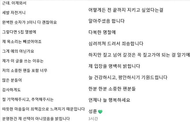 그러면서 팬들은 각자의 길을 걷기로 한 브아솔과 성훈이 모두 성공하길 바라는 마음을 드러내기도 했습니다. 그의 인스타그램을 찾아온 많은 팬들은 "글 내용에 큰 충격을 받았지만 잘 해결해서 모두 잘 활동해주길 바란다" "이런 사연이 있었다니 참 아쉽다" "어느 쪽이든 잘못한 부분이 있으면 사과를 제대로 하고 넘어갔으면 좋겠다" "이번 앨범에 목소리가 담겨있길래 잘 마무리한 줄 알았는데 아니라니 당황스럽다"라는 등 다양한 반응을 보이고 있습니다.