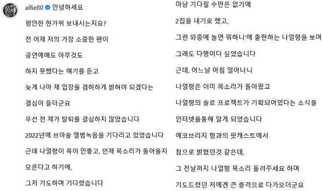 그러면서 팬들은 각자의 길을 걷기로 한 브아솔과 성훈이 모두 성공하길 바라는 마음을 드러내기도 했습니다. 그의 인스타그램을 찾아온 많은 팬들은 "글 내용에 큰 충격을 받았지만 잘 해결해서 모두 잘 활동해주길 바란다" "이런 사연이 있었다니 참 아쉽다" "어느 쪽이든 잘못한 부분이 있으면 사과를 제대로 하고 넘어갔으면 좋겠다" "이번 앨범에 목소리가 담겨있길래 잘 마무리한 줄 알았는데 아니라니 당황스럽다"라는 등 다양한 반응을 보이고 있습니다.