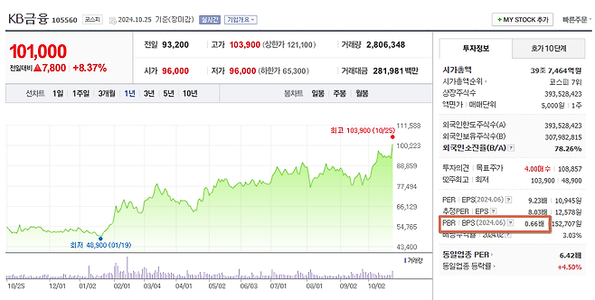 KB금융의 시가총액은 약 39조 원이다. 2024년 반기 기준 자본총계(순자산) 약 60조 원으로 ‘PBR=0.66’이다. 1보다 적은 수치다. 그런데 불과 1년 전에는 시가총액 약 26.3조원으로 PBR이 0.44에 불과했다.