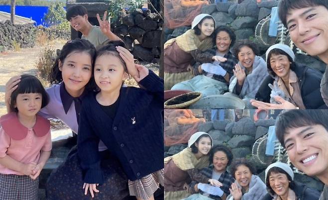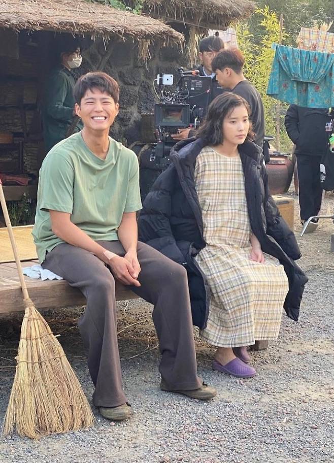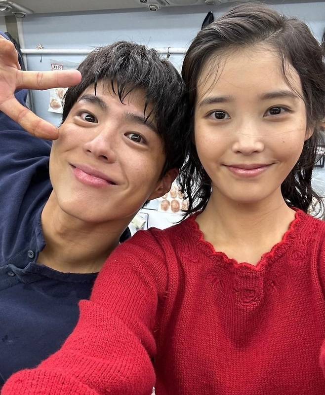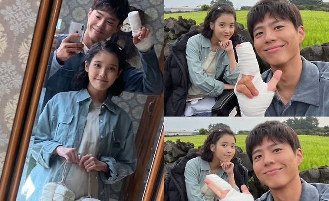 “왼쪽 사진 약간 지쳐보이는 아이유 뒤에 마냥 신난 댕댕이 박보검 보이시나요?ㅋㅋㅋ확신의 대문자 EEEE상 박보검”