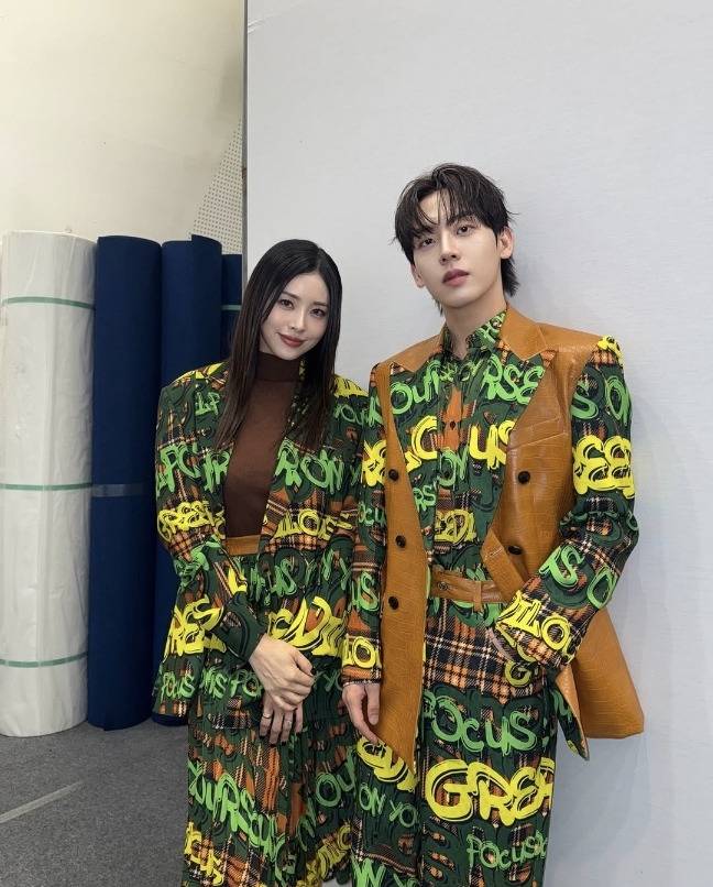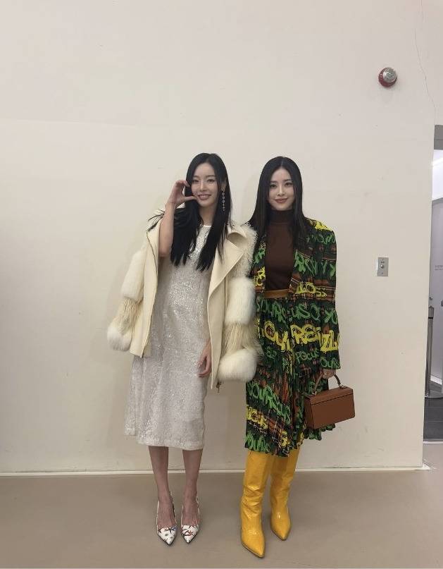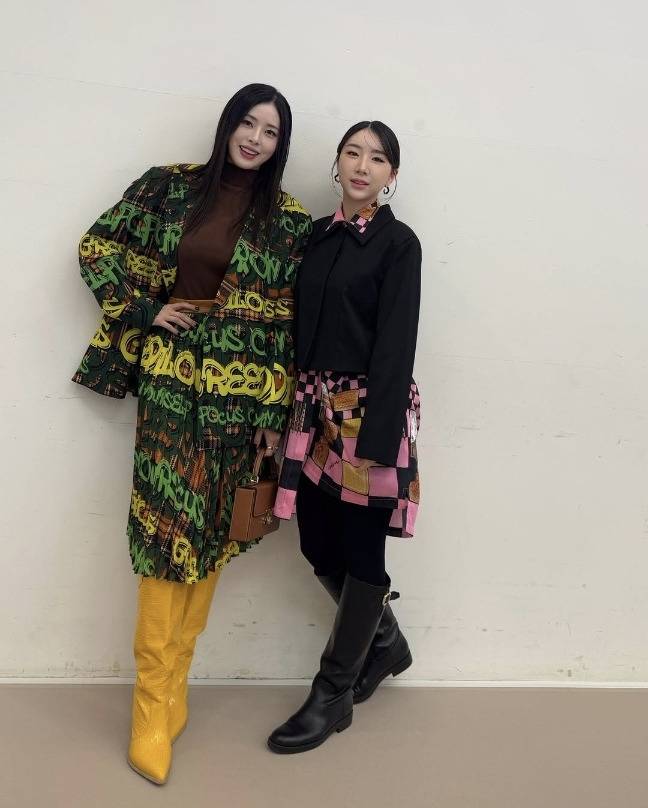 서동주는 초록과 노랑이 어우러진 그라피티 패턴의 오버핏 재킷과 플리츠스커트 셋업으로 강렬한 존재감을 드러냈습니다.
