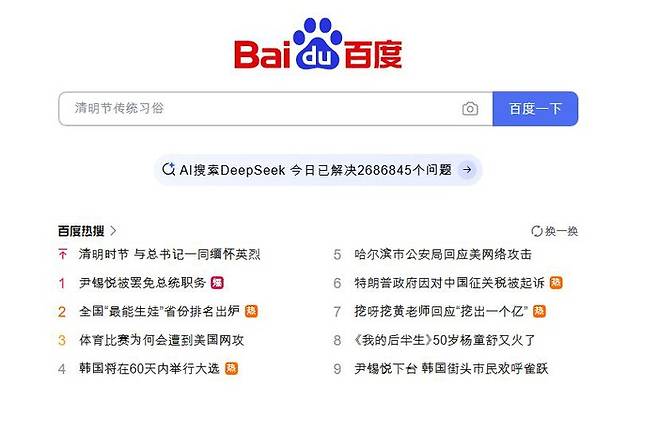 중국 최대 포털 바이두 메인페이지에 ‘윤석열, 대통령 직무서 파면’이 검색어 1위에 있다.