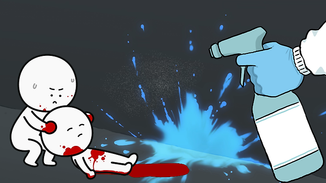 이후 경찰이 범인을 추적하는 과정에서 범행 현장으로 추정되는 장소를 찾은 뒤 어떤 액체를 뿌려 혈흔을 발견하는 장면으로 이어지는데, 이때 핏자국이 묻은 곳이 푸른색으로 빛나고, 경찰은 이를 통해 해당 장소에서 범행이 벌어졌음을 알 수 있게 됩니다.