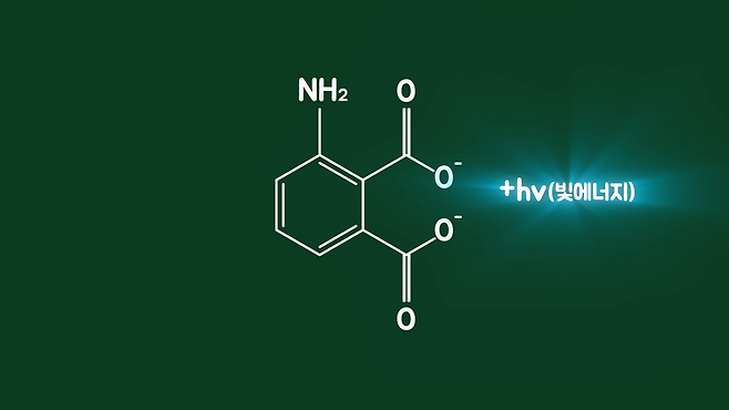 루미놀은 2개의 육각형 고리에 3개의 질소 원자, 2개의 산소 원자로 구성된 분자 구조를 가진 화합물입니다. 이를 염기성 용액에 녹이면 질소(N) 옆에 결합하고 있던 수소(H)가 분리되는데, 여기에 과산화수소를 넣으면 산소(O)가 결합하고, 질소가 분리되면서 에너지가 높은 불안정한 상태인 들뜬 상태(excited state)가 됩니다.