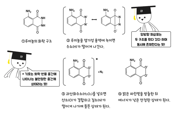 바닥 상태 때 루미놀 용액에서 방출하는 에너지에 해당하는 것이 밝은 파란빛이고, 루미놀이 화학 반응에 의해 파랗게 발광하는 현상을 루미놀 반응 또는 형광 반응이라고 합니다.