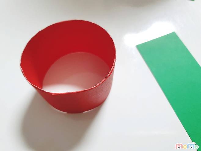 먼저 빨간색 색종이와 초록색 색종이를 길게 잘라주세요. 색종이를 두번 반 접어 잘라주었어요.