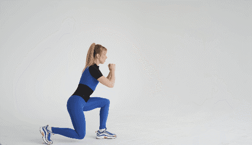 바닥에 서서 시작한 뒤, 오른쪽 다리를 뒤로 뻗으며 무릎을 구부려 런지 자세를 취합니다. 런지에서 일어서면서 오른발을 뒤로 뻗어 킥백 동작으로 연결합니다. 다리 위치를 바꿔서 운동하세요.