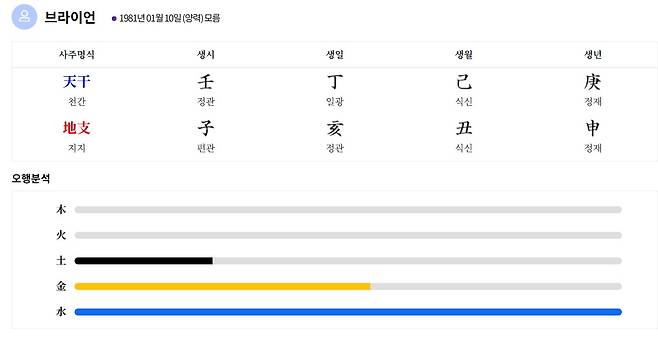 브라이언은 ‘사람을 통해 재물을 얻는’ 인복 중심의 사주를 가진 사람입니다.