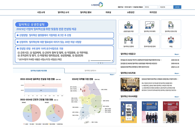 이에 따라 ▲임금체계 개편 ▲근로시간 단축 ▲조직문화 개선 ▲차별 개선 ▲공정 채용 등 9개 분야의 19개 요구사항을 중심으로 노사발전재단과 17개 민간 전문기관이 종합적인 컨설팅을 제공하도록 개편했습니다. 컨설팅 지원 대상은 일터혁신의 필요성에 공감하고 추진 의지가 있는 20인 이상 사업장입니다. 지원을 희망하는 사업장은 일터혁신 플랫폼(kwpi.or.kr)을 통해 신청하면 됩니다. 관련 상담·문의는 대표번호(02-6021-1176)를 통해 가능합니다.