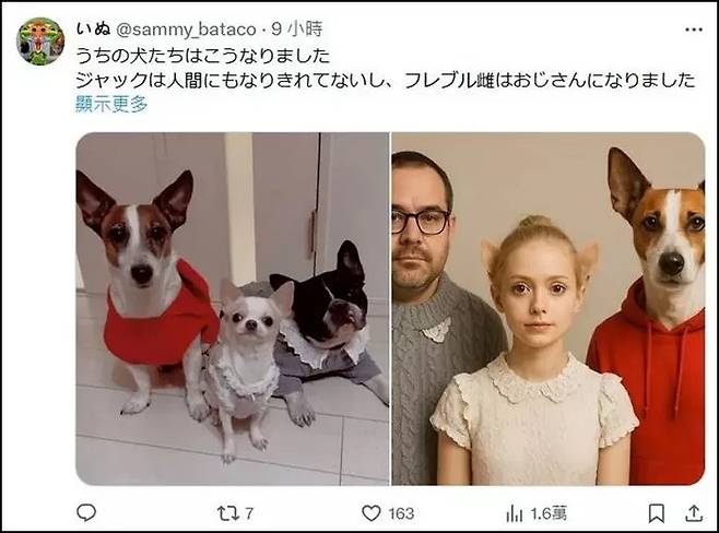 최근 일본 X(옛 트위터)에는 “우리 집 개들이 이렇게 됐다”라는 글과 함께, 반려견 세 마리를 사람으로 바꿔 본 이미지가 올라왔다. 실제 견종의 특징을 살려 바꾼 결과물은 사람 모습이지만 귀가 남아 있고, 눈빛이나 옷차림에서 원래 동물의 흔적이 그대로 남아 있어 많은 이들의 관심을 끌었다.