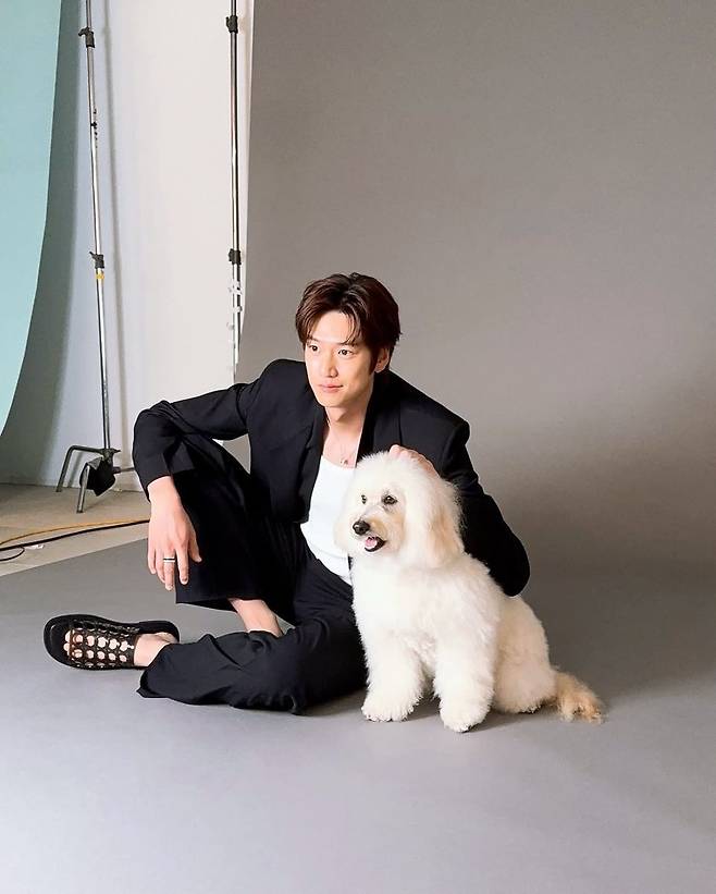 나인우의 근황이 담긴 화보 촬영 현장 사진이 팬들의 이목을 끌고 있다. 깔끔한 블랙 수트에 슬쩍 드러난 화이트 이너, 그리고 발끝에 포인트를 준 메시 러버 샌들까지—시크함과 꾸안꾸 무드를 동시에 아우른 스타일링이 눈길을 사로잡는다. 그 곁에 나란히 앉은 복슬복슬한 반려견은 나인우의 따뜻한 성격을 그대로 드러낸다.