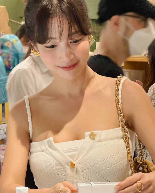 사진 속 기은세는 탱크톱에 가디건을 매치해 러블리한 미모를 뽐냈습니다.