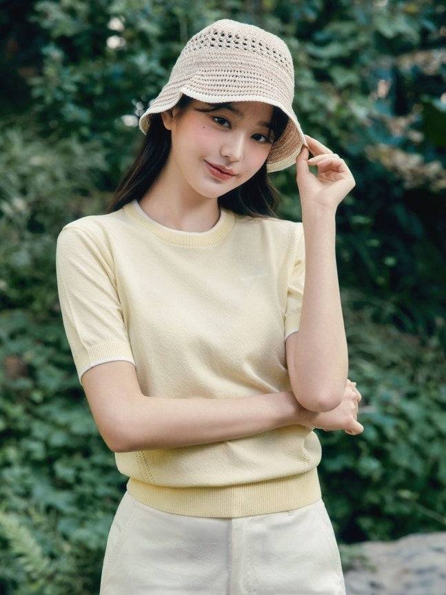 요 모자는 전체적으로 시선을 부드럽게 모아주면서 얼굴선을 자연스럽게 감싸줘. 덕분에 웨이브 헤어, 내추럴 스트레이트 헤어 모두 찰떡 소화 가능! 그녀처럼 연한 옐로우 톤 상의와 매치하면 별다른 스타일링 없이도 여름 분위기 뿜뿜! 💛