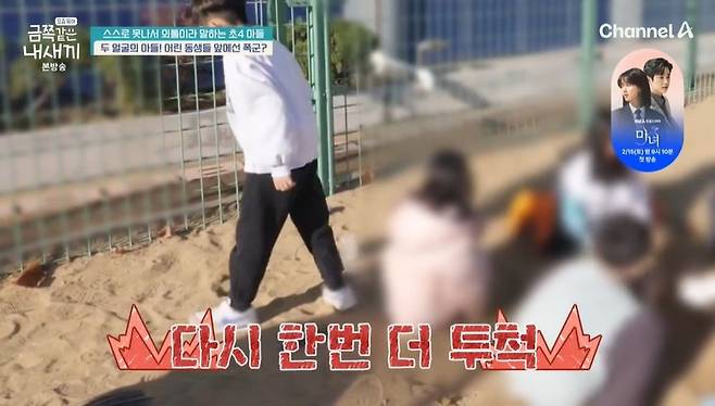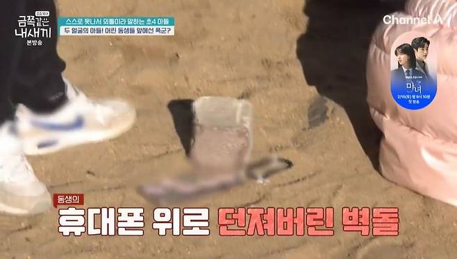 금쪽이는 심지어 욕설을 내뱉으며 모래를 발로 찼고, 벽돌을 집어 들어 동생 휴대폰 위에 던졌다.