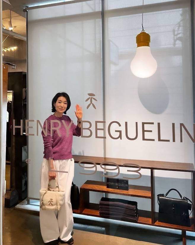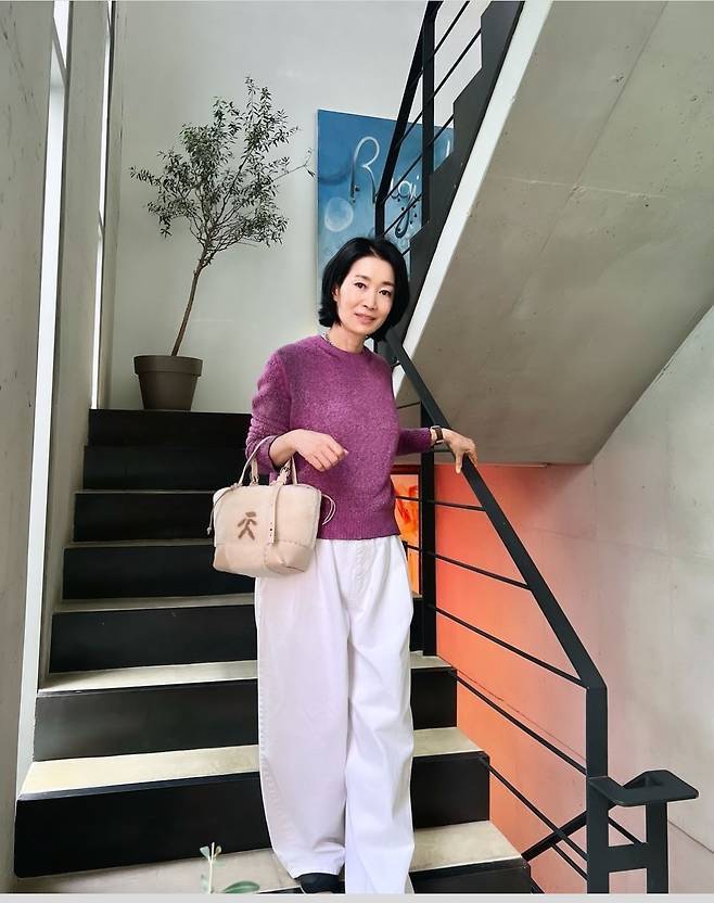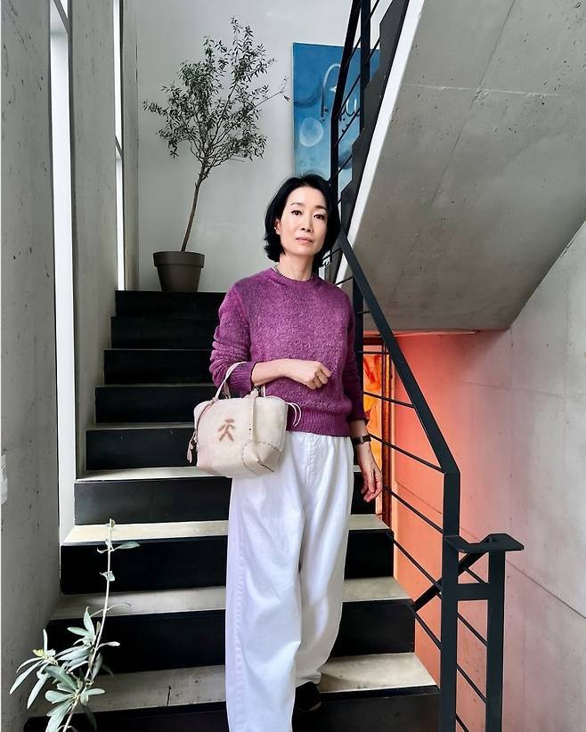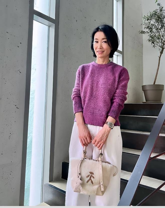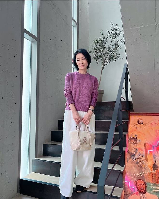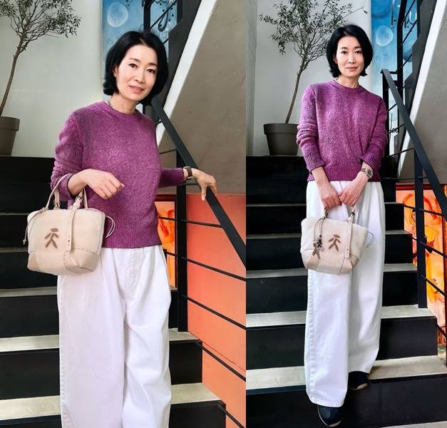 나영희는 퍼플 니트와 화이트 팬츠의 조합으로 따뜻하면서도 시크한 매력을 더했습니다.