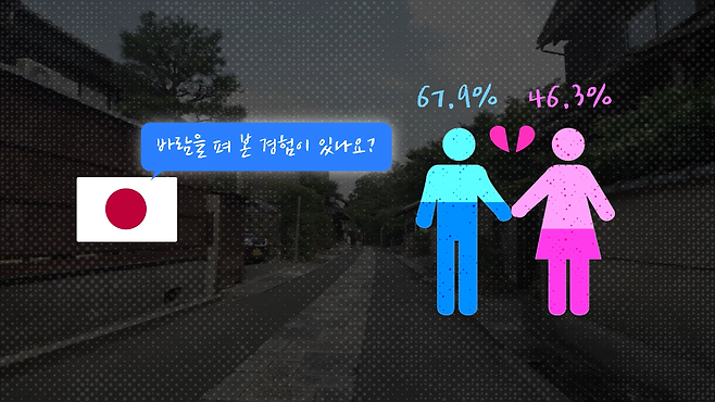 일본인들, 진짜 불륜이 일상화된 것 같긴 하다. 2020년 일본가족계획협회가 성인남녀 5000명한테 물었는데, 바람핀 경험이 있다고 답한 남성은 67.9%, 여성은 46.3%이나 됐다.