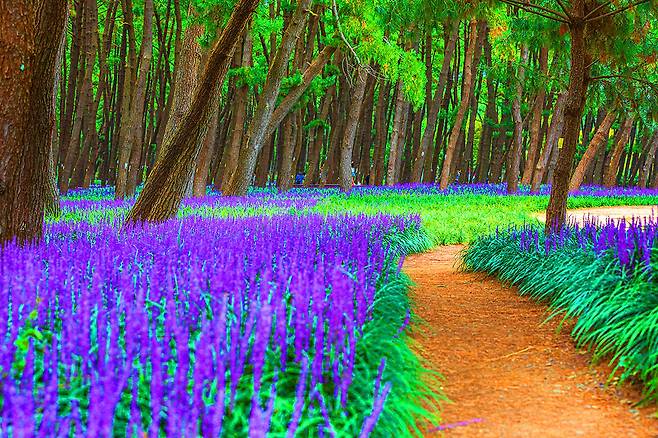 연간 100만 명이 방문하는 장항 송림산림욕장은 약 28㎡의 소나무 숲에 600만 본 맥문동꽃을 심어 전국 최대의 맥문동 군락을 이룹니다.