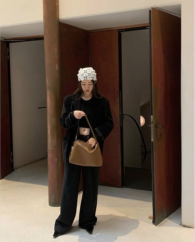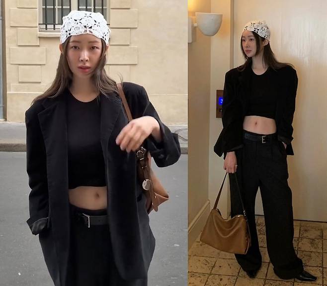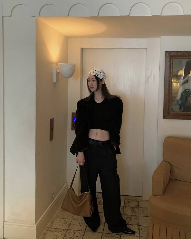 차정원은 올블랙 크롭탑과 오버핏 블랙 재킷, 와이드 팬츠를 매치해 시크하면서도 편안한 분위기를 연출했습니다.
