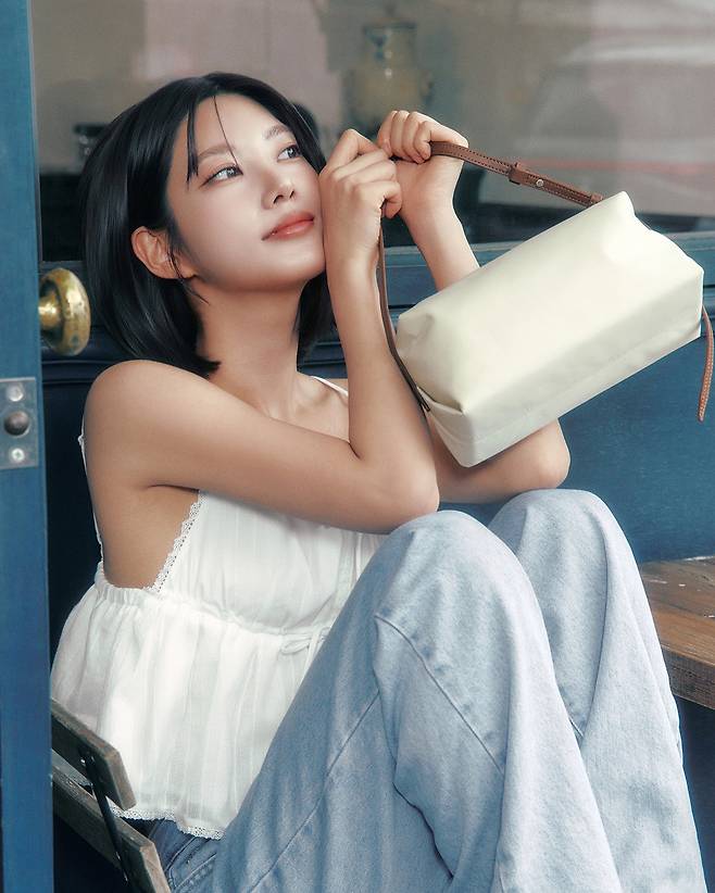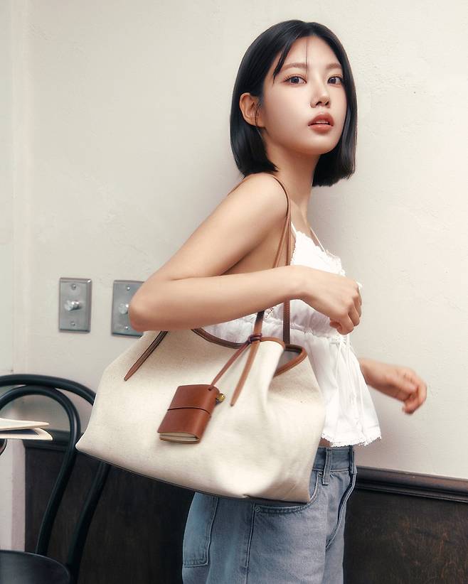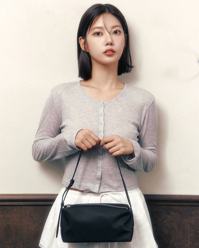 짧은 단발에 굵은 C컬로 자연스럽게 연출된 헤어는 이번 룩과 조화를 이루며 청순한 무드를 극대화했고, 살짝 치켜뜬 눈빛과 미소가 더해져 감성적인 분위기를 완성했어요.