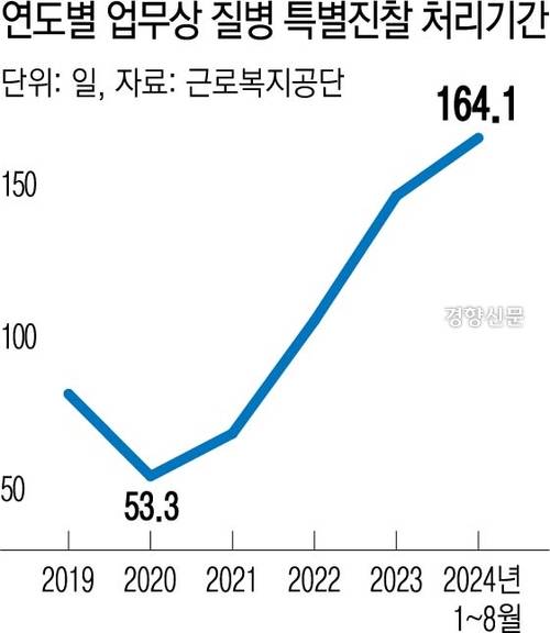 올해 들어 업무상 질병 여부 판정을 위한 특별진찰(특진) 결과가 나올 때까지 걸리는 기간이 무려 164.1일인 것으로 나타났다. 산재 처리 장기화 요인인 특진 처리기간 증가에 대한 근본적 대책이 필요하다는 지적이 나온다.