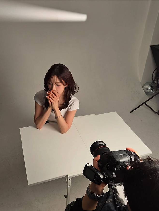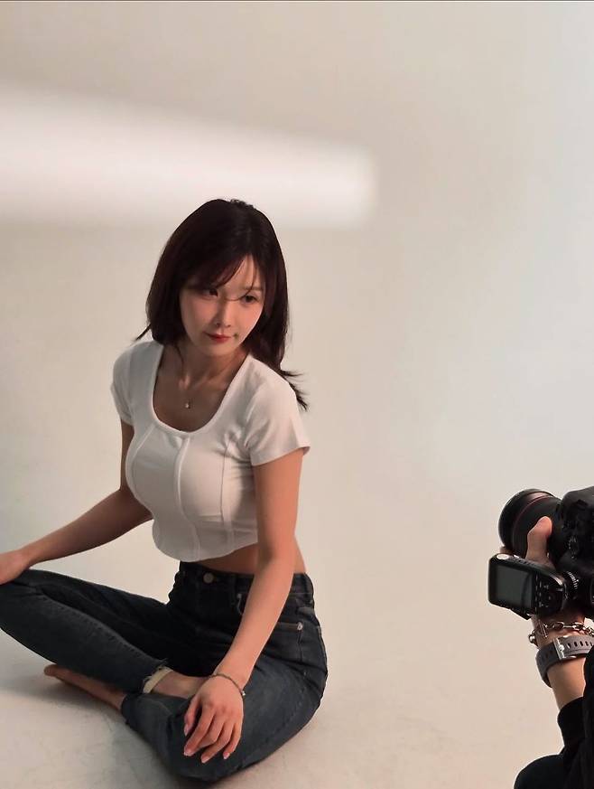 조현영이 인스타그램에 공개한 촬영 비하인드 컷이 팬들의 시선을 사로잡고 있다. 자연광이 은은하게 들어오는 스튜디오 한 켠에서 촬영된 이번 컷은 화이트 티셔츠와 데님 팬츠라는 심플한 조합으로 조현영 특유의 담백하고 자연스러운 분위기를 극대화했다.