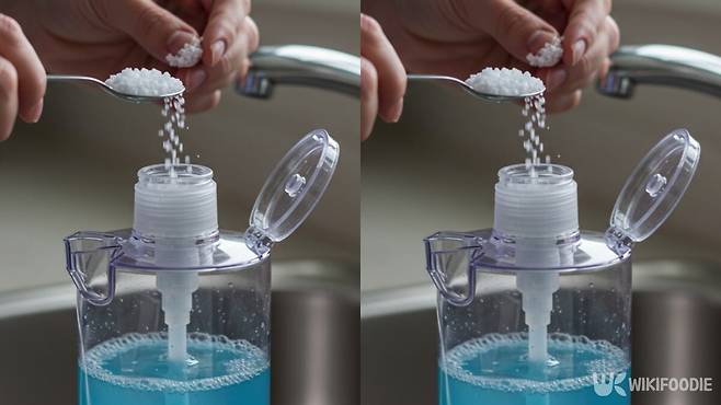 필요한 재료는 네 가지뿐이다. 주방세제 1컵, 물 1컵, 소금 2스푼, 베이킹소다 1스푼. 주방세제와 물을 먼저 섞고, 소금을 넣는다. 마지막으로 베이킹소다를 넣어 마무리하면 끝이다.