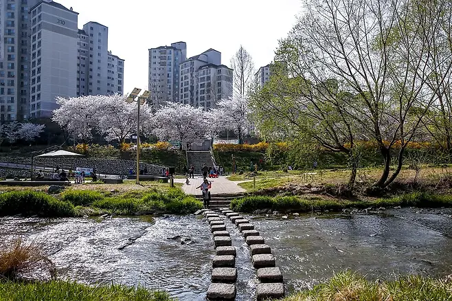 하천을 따라 피어난 벚꽃길이 6㎞나 이어지는 도심 속 산책 코스다. 봄꽃 터널 아래로 작은 다리가 놓여 있어, 사진 찍기 좋은 포인트가 많다. 저녁 무렵에는 조명과 어우러져 은은한 무드를 자아내므로, 연인들의 야간 벚꽃 데이트 명소로도 인기다.