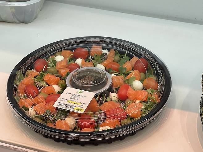 연어, 올리브, 보코치니, 방울토마토, 어린잎으로 구성된 카프레제 샐러드에요.